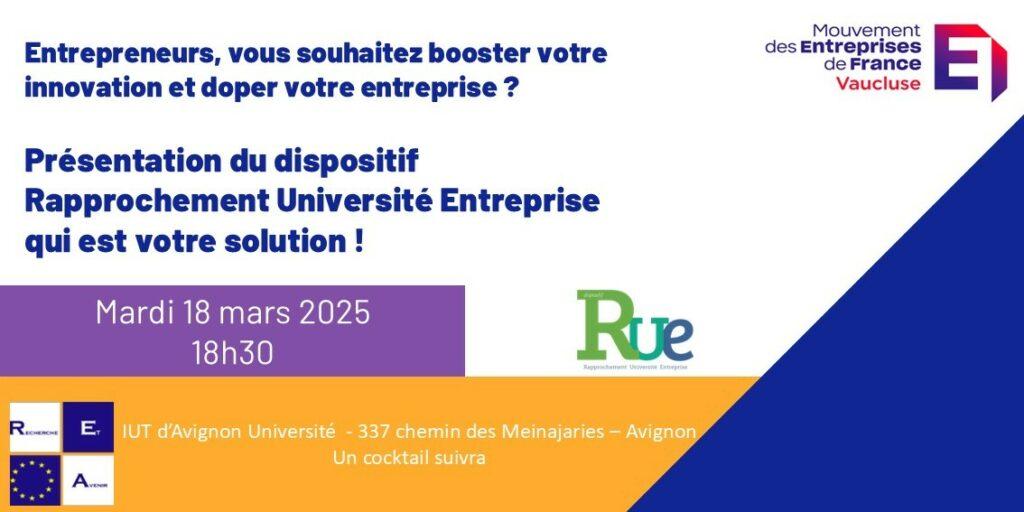 Le Medef Vaucluse est très heureux de vous inviter à la présentation de ce dispositif RUE, le mardi 18 mars à 18h30, à l’IUT d’Avignon, 337 chemin Meinajariés 84140 Avignon